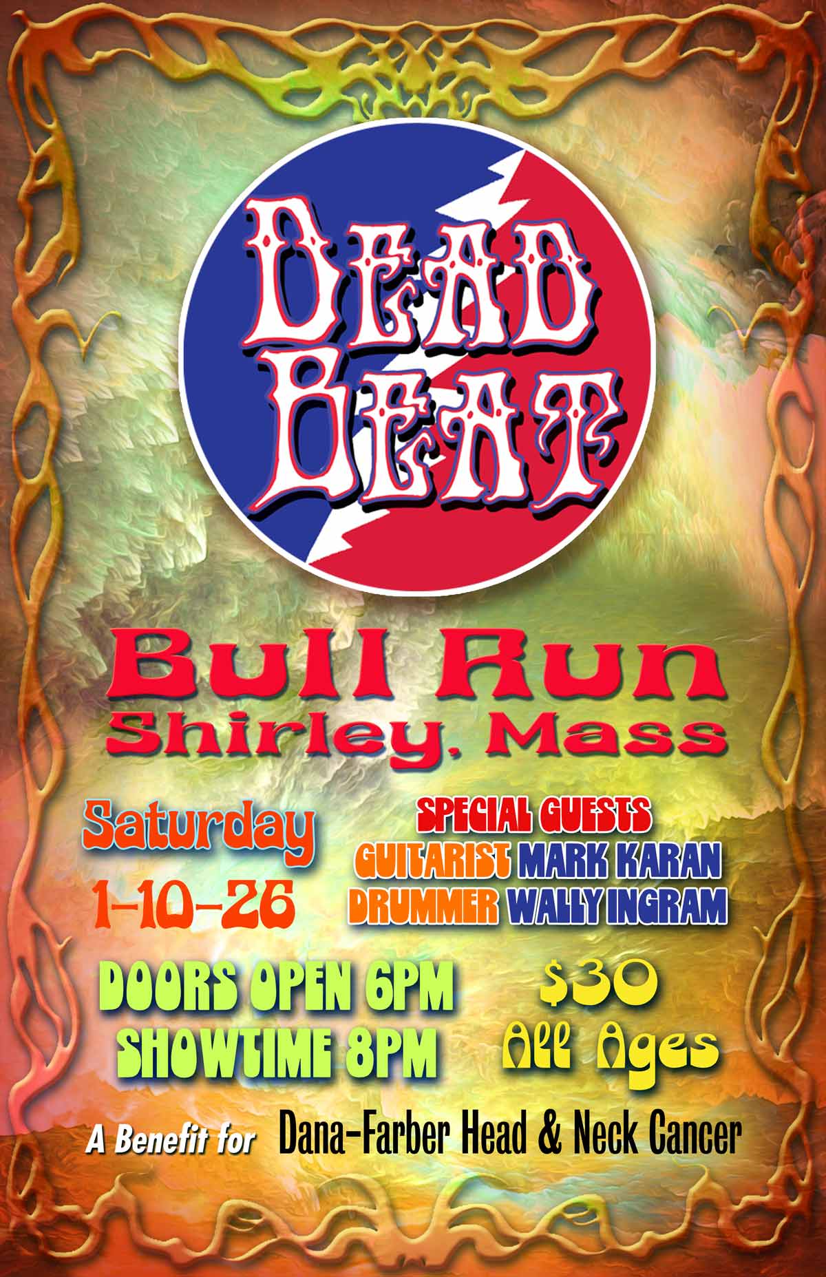 DeadBeat and friends, guitarist Mark Karan (The Other Ones & Bob Weir’s Rat Dog) along with drummer Wally Ingram (Timbuk 3, Bob Weir and The Phil Lesh Duo) will be laying down the grooves at The Bull Run in Shirley, MA on 1/10/26 and $5 of every ticket will be donated to Head & Neck Cancer Center at Dana-Farber.